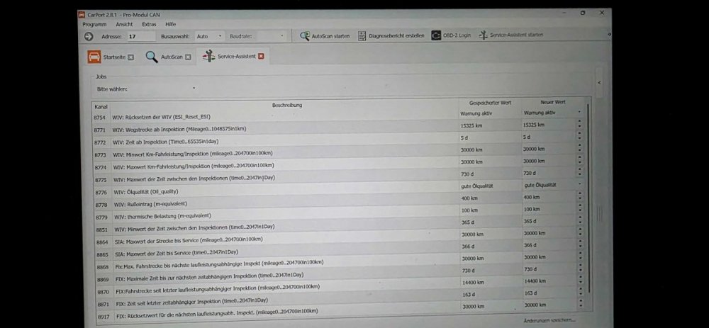 Hallo, was heisst "15000km-Ölwechsel"? Und was heisst "30000km-Intervall vorgetäuscht"? In Kanal 8771 gehört die Strecke, die Du seit dem Ölwechsel gefahren bist. (Analog zu den 5 Tagen im Kanal 8872, die seit dem Ölwechsel vergangen sind.) Außerdem muss in den Kanal 8773 der Wert 15000km rein. Wenn kein Long-Life-Öl eingefüllt wurde, muss im Kanal 8876 "Ölqualität schlecht"eingestellt werden. Grüße, Prizo