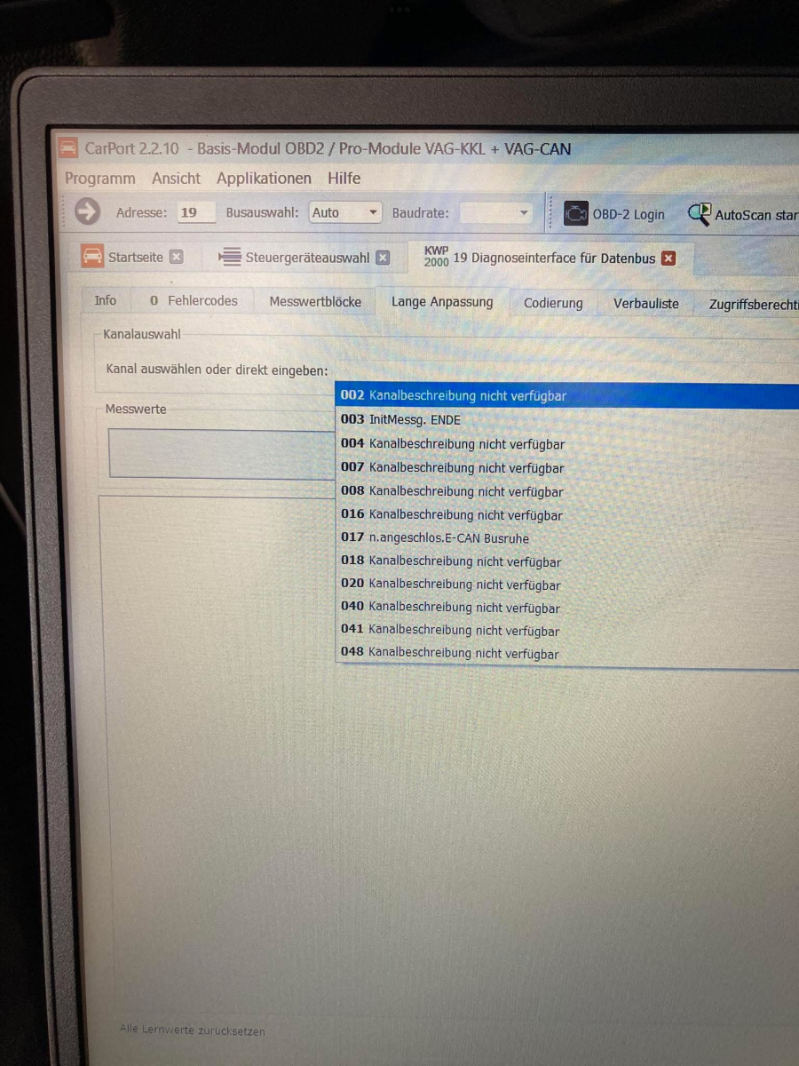 Schmatzek1 Erstellt vor 9 Stunden Erstellt vor 9 Stunden Moin, ich nutze Carport Pro-Module KKL+CAN. Allerdings noch in der Softwareversion 2.2.10, da das der letzte Stand ist den ich noch Updaten konnte. Interface ist CP Compact mit der Firmware 1.0.8 Ich möchte bei einem VW EOS 2012 die Batterie anlernen. Wenn ich unter Adresse 19 - Diagnoseinterface für Datenbus auf den Reiter „lange Anpassung“ klicke, dann kann ich da nichts auswählen was irgendwie nach Batterie ausschaut. Es zeigt mir nur an, das alles mögliche nicht verfügbar ist. Ich kann mir eigentlich nicht vorstellen das mein Softwarestand aus 2015 zu alt für ein 2012er Fahrzeug sein soll. Kann mir jemand sagen wo das Problem liegt? Grüße MJ Zitieren